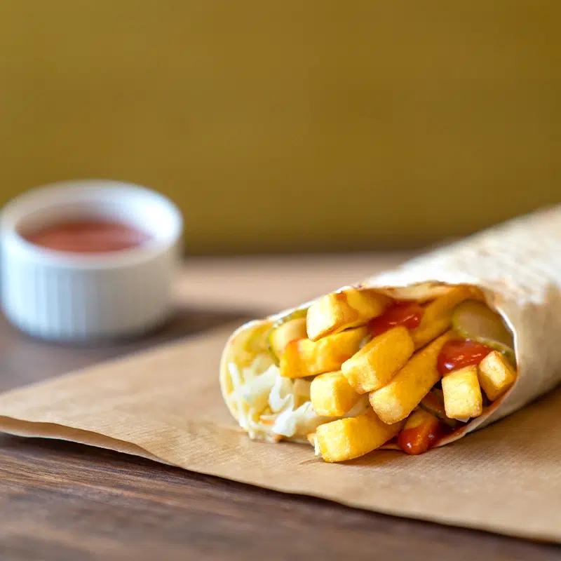 Mekane tavuk pileće kockice, hrskava coleslaw salata, kiseli krastavac, pomfrit, kečap, sa sosom po izboru na bazi belog luka ili majoneza, sve umotano i tostirano u lavaš hlebu