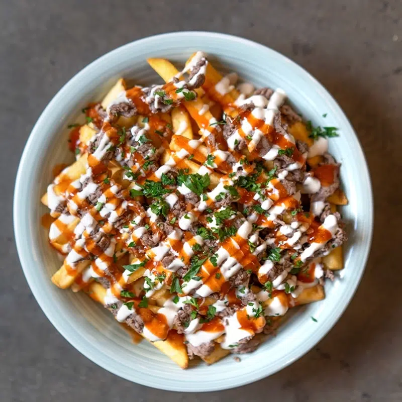 Za one koji vole da im hrana bude „neuredna“ — hrskavi zlatni pomfrit prekriven piletinom ili govedinom i preliven dvema bogatim sosovima.