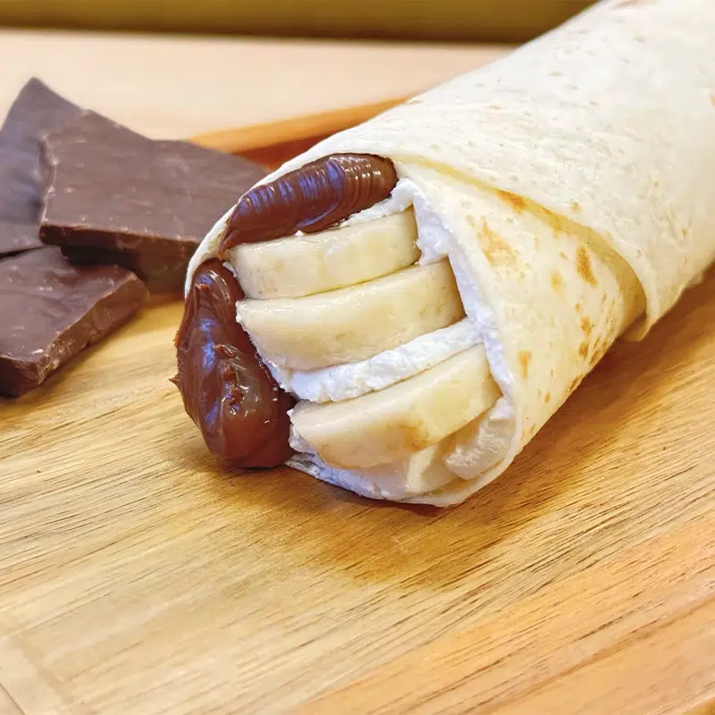 Ukusni wrap punjen slatkim kremom, bogatim čokoladnim namazom i svežim kriškama banane. Savršen spoj kremastog, čokoladnog i voćnog ukusa!