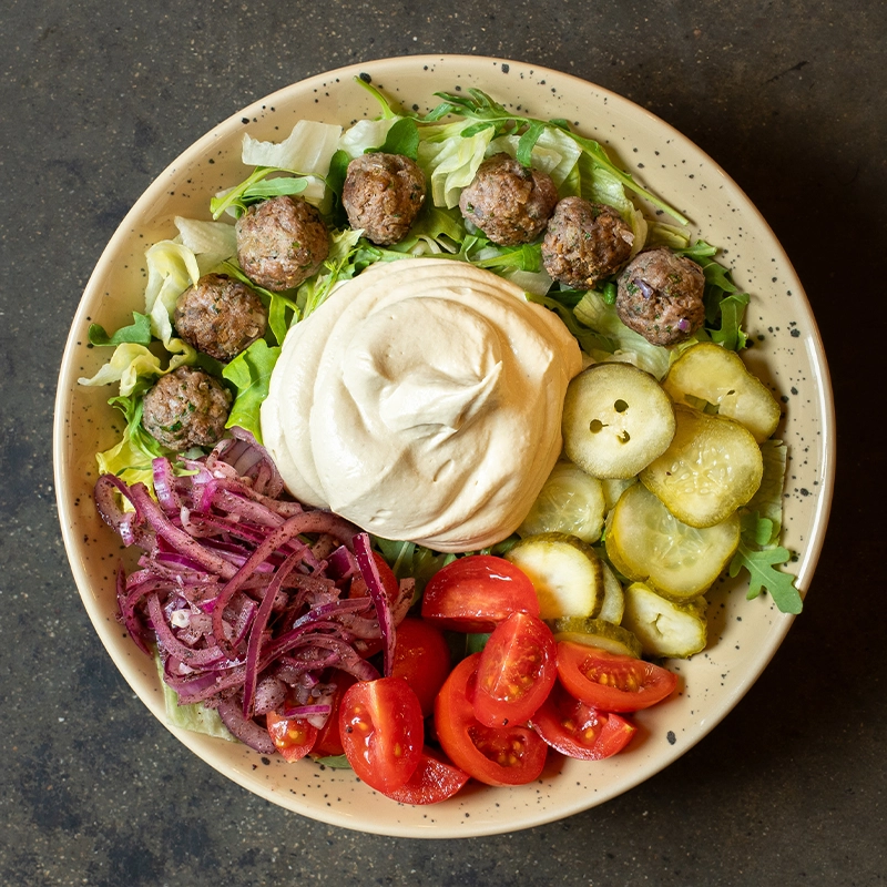 100% govedja kafta u ciniji – sa miksom zelene salate koja je prelivena limun senf dresingom, čeri paradajz, kiseli krastavci, sumak luk i humus (484kcal)